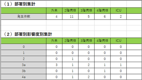 ●レポート一覧からEXCEL出力時に影響度・発生場面・事案分類ごとに集計表を出力されます。